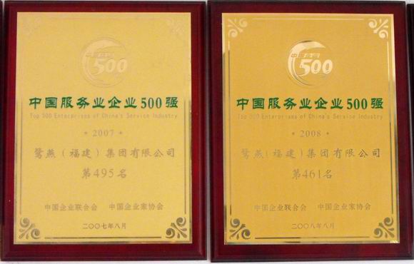 鷺燕集團(tuán)又傳捷報(bào),在榮獲了“市百?gòu)?qiáng)企業(yè)”、“市重點(diǎn)民營(yíng)企業(yè)”、“湖里區(qū)十佳文明企業(yè)”之后,再次榮獲“中國(guó)服務(wù)企業(yè)500強(qiáng)”稱號(hào),這已是鷺燕集團(tuán)連續(xù)三年獲此殊榮。