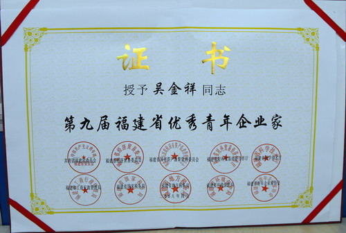 [喜訊] 日前,由共青團福建省委員會、福建省經(jīng)濟貿(mào)易委員會、福建省國有資產(chǎn)監(jiān)督管理委員會、福建省對外貿(mào)易經(jīng)濟合作廳、福建省科學技術廳、福建省工商行政管理局、福建省國家稅務局、福建省地方稅務局、福建省環(huán)境保護局、福建省青年企業(yè)家協(xié)會共同主辦的“第九屆福建省優(yōu)秀青年企業(yè)家”評選活動揭曉,鷺燕集團董事長兼總裁---吳金祥先生榮獲“福建省優(yōu)秀青年企業(yè)家”榮譽稱號!
