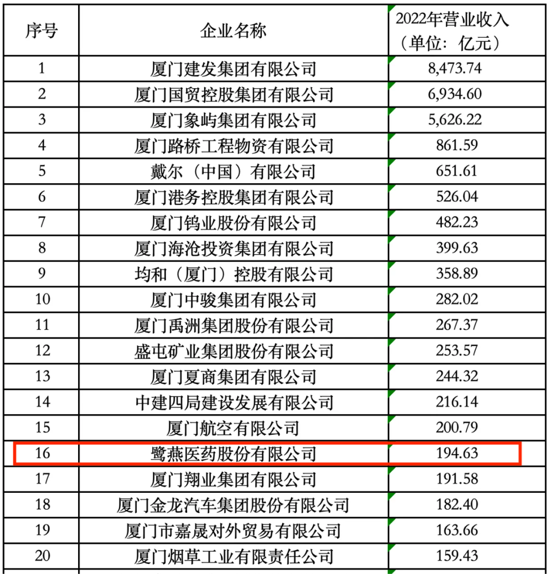 2023年11月25日,廈門企業(yè)和企業(yè)家聯(lián)合會發(fā)布2023廈門企業(yè)百強榜單,鷺燕醫(yī)藥股份有限公司榮列第16位!