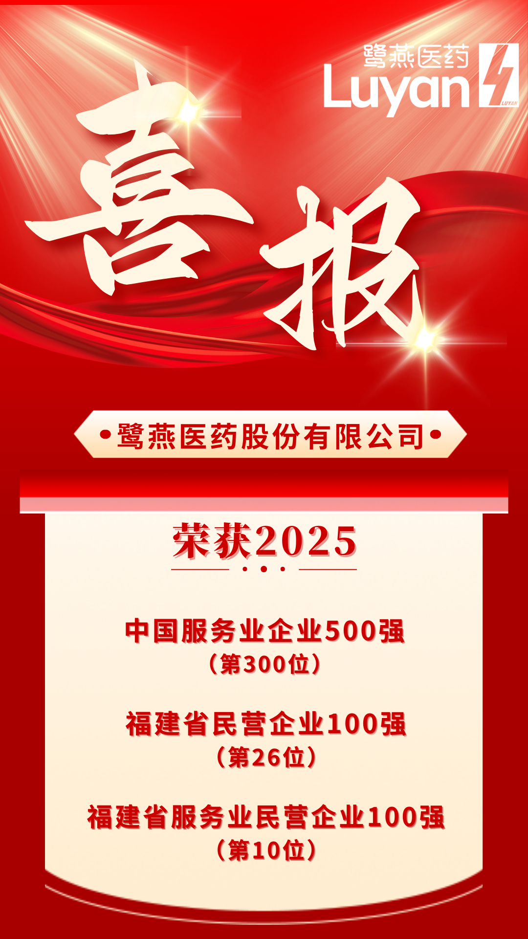 9月28日,福建省工商業(yè)聯(lián)合會在寧德發(fā)布“2025福建民營企業(yè)100強”,鷺燕醫(yī)藥連續(xù)5年上榜,列第26位。同時,在“2025福建省服務業(yè)民營企業(yè)100強”榜單上,鷺燕醫(yī)藥連續(xù)3年上榜,位居第10位。