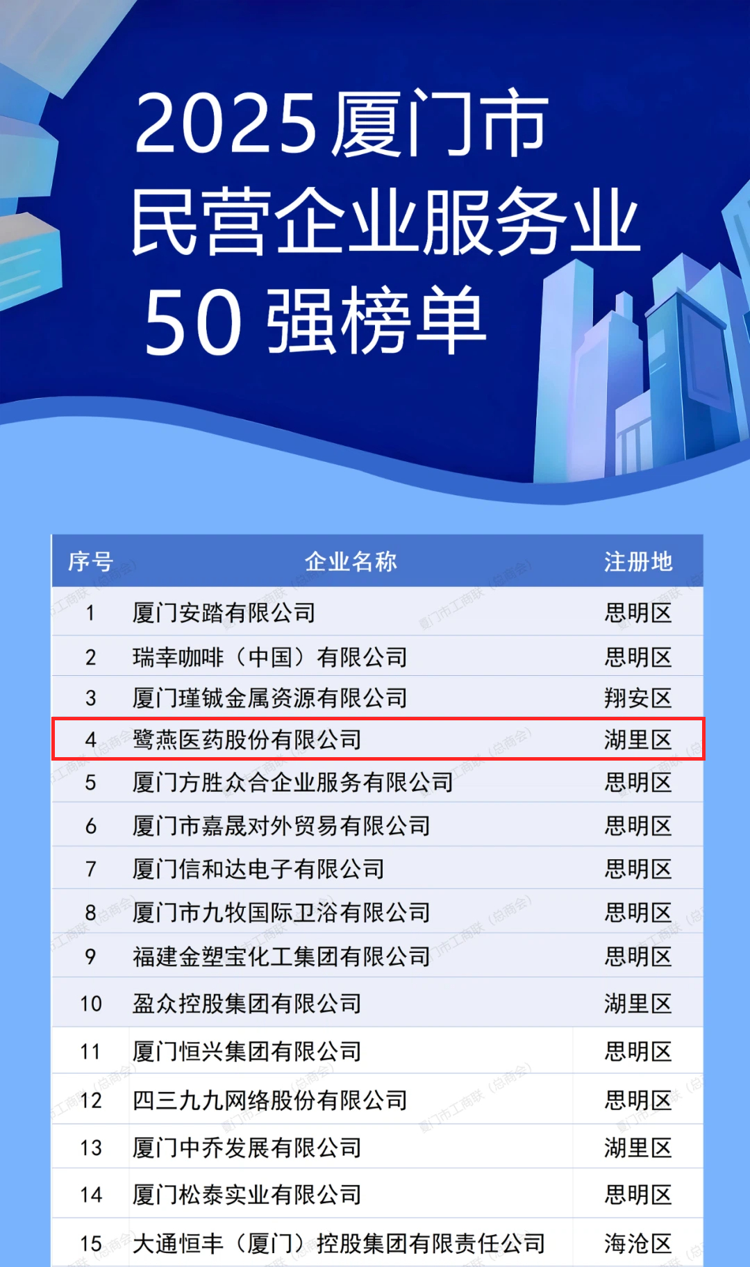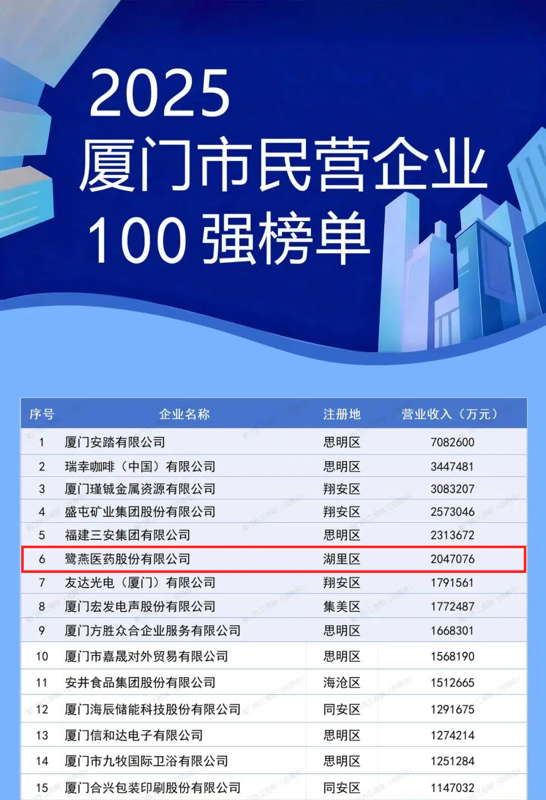 11月1日上午,2025年廈門企業(yè)家日大會(huì)召開。大會(huì)發(fā)布了2025廈門市民營企業(yè)100強(qiáng)系列榜單,介紹了廈門市民營經(jīng)濟(jì)發(fā)展態(tài)勢(shì)和營商環(huán)境建設(shè)成效。鷺燕醫(yī)藥股份有限公司憑借上市企業(yè)綜合實(shí)力,榮膺“2025廈門市民營企業(yè)100強(qiáng)”第6位,以及“2025廈門市民營企業(yè)服務(wù)業(yè)50強(qiáng)”第4位。