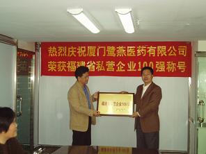 由福建省私營企業(yè)協(xié)會、福建日報社聯(lián)合開展的2005年度“福建省私營企業(yè)100強”評定活動,于近日揭曉最終入圍企業(yè),廈門鷺燕醫(yī)藥有限公司榜上有名。今天,市工商局的領導來我司進行了授牌儀式。儀式上,吳金祥總裁向領導們介紹了鷺燕的成長歷程,并對將來的經營進行了展望。領導們在聽取了吳總裁的匯報后,肯定了鷺燕的發(fā)展模式,同時,也對鷺燕的可持續(xù)發(fā)展提出了許多有益的建議。